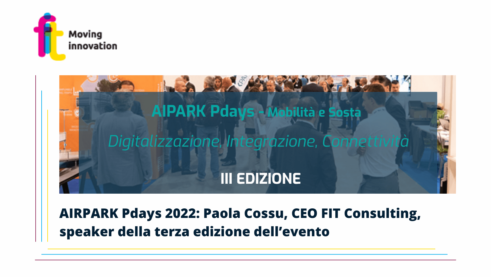 Paola Cossu, CEO FIT Consulting, sarà speaker della Sessione 6, in programma il 23 giugno alle ore 11:00, dal titolo “L’evoluzione del settore della sosta” con un intervento sul tema “La logistica urbana e la necessità della sosta”.