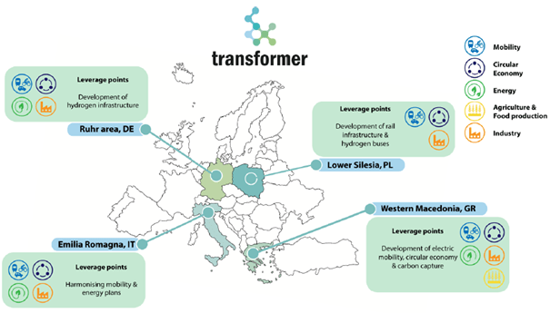 Quattro Transition Super-Labs (TLS) saranno sperimentati in regioni europee con una sfida di transizione particolarmente difficile da affrontare – l’Area della Ruhr (Germania), l’Emilia Romagna (Italia), la Bassa Silesia (Polonia) e la Macedonia occidentale (Grecia) – affrontando cinque settori chiave: Mobilità, Economia circolare, Energia, Agricoltura e produzione alimentare e Industria, attraverso specifici punti di leva che li collegano.