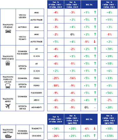 Continua la tendenza positiva della domanda di mobilità per tutte le modalità di trasporto, che nel primo trimestre del 2023 registra una crescita rispetto all’analogo periodo del 2022, con aumenti compresi tra il 3% per il trasporto bus su rete Anas e il 378% per i servizi marittimi crocieristici.