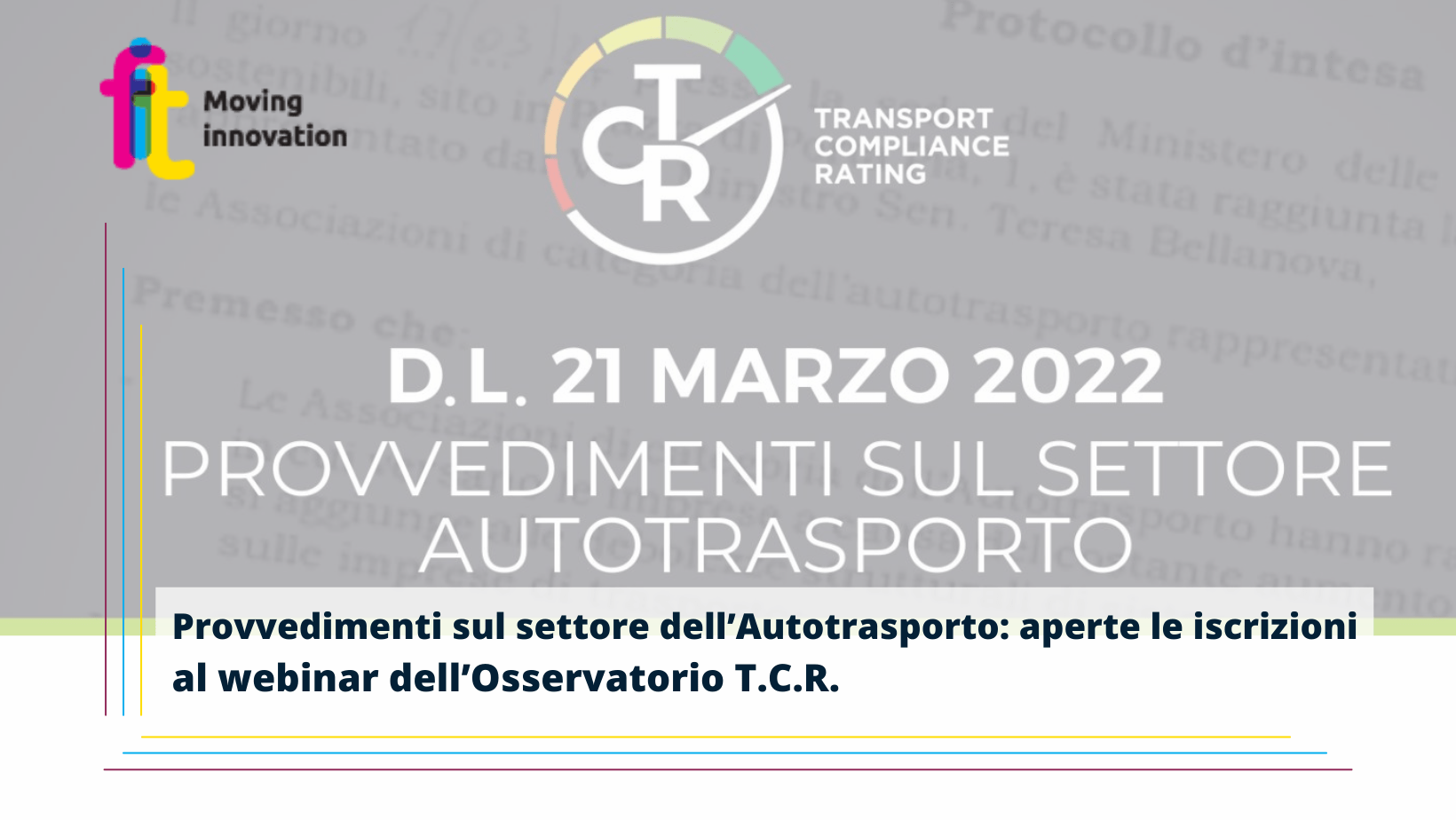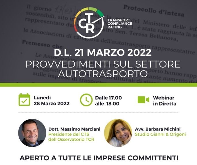 Si terrà lunedì 28 marzo, dalle 17 alle 18, il webinar organizzato dall’Osservatorio Transport Compliance Rating durante il quale saranno illustrate le disposizioni riferite al settore dell’autotrasporto contenute nel Decreto Legge 21 marzo 2022.