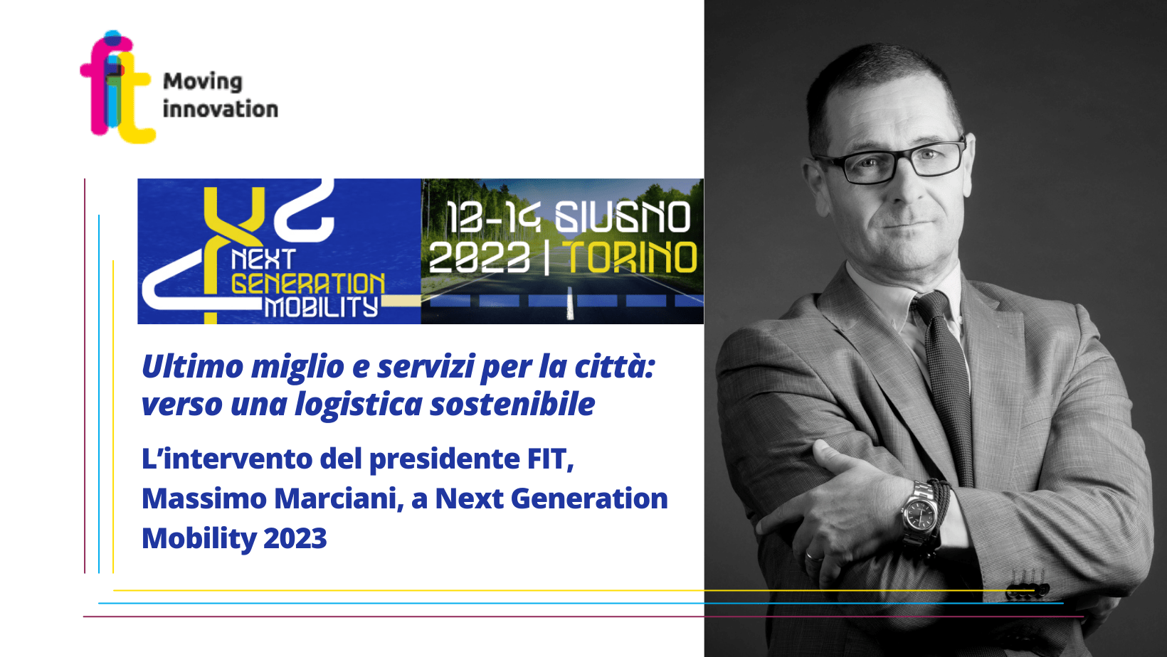 Il 13 e 14 giugno si è svolto a Torino, presso il Centro congresso Unione Industriali, Next Generation Mobility, terza edizione dell’evento dedicato ai temi della mobilità a cui ha preso parte in qualità di relatore anche il presidente di FIT Consulting Massimo Marciani, intervenuto alla tavola rotonda “Ultimo miglio e servizi per la città: verso una logistica sostenibile” con uno speech dedicato al rapporto tra intermodalità e ultimo miglio logistico.
